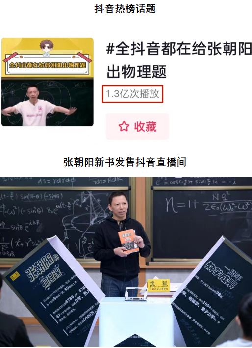 《张朝阳的物理课》精编了张朝阳在搜狐视频物理直播课的前50讲内容,为面向大众的物理科普读物。该书于今年11月,由中信出版社出版。11月5日恰逢张朝阳的物理课开播一周年,他以此为契机先后发布一系列新书预热视频,并于11月6日在其抖音账号直播间进行线下第十课授讲并正式发售新书。当日观看人次近748w,“全抖音都在给张朝阳出物理题”的话题也冲上抖音热榜首位,图书销售额达1w以上,对于相对晦涩难懂、观众消费意愿较低的物理科普读物已是不错的成绩。